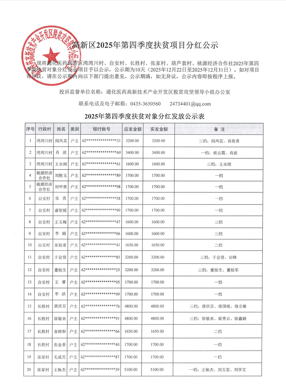 2025年第四季度扶贫项目分红公示